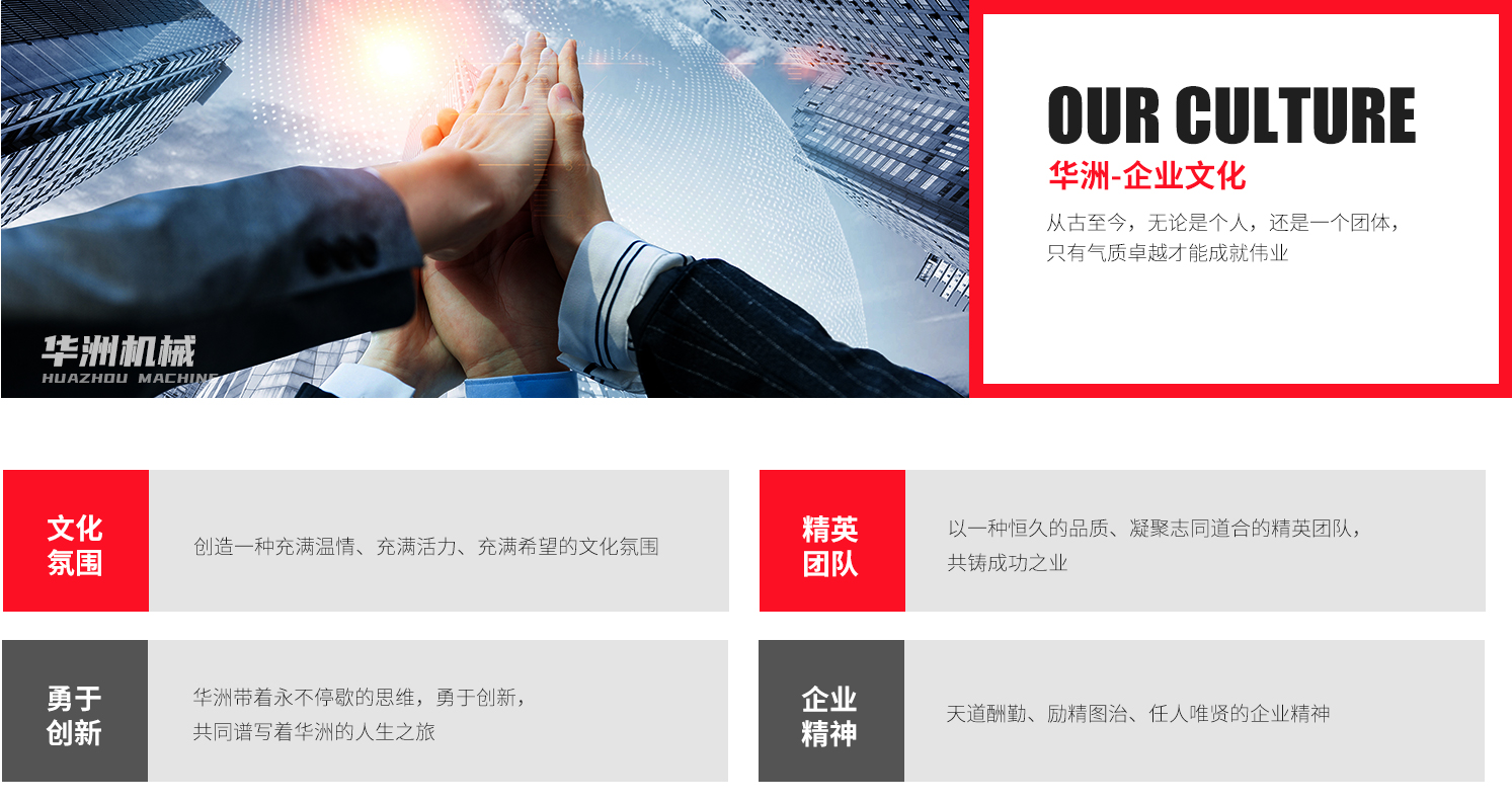 一個(gè)企業(yè),只有創(chuàng)造一種充滿溫情、充滿活力、充滿希望的文化氛圍,才能散發(fā)出獨(dú)特的性格魅力, 以一種恒久的品質(zhì)、凝聚志同道合的精英團(tuán)隊(duì),共鑄成功之業(yè)。 華洲帶著永不停歇的思維,勇于創(chuàng)新,共同譜寫著華洲的人生之旅。天道酬勤、勵(lì)精圖治、任人唯賢的企業(yè)精神,創(chuàng)造學(xué)習(xí)型組織,用激情演繹精良,用勤奮推動(dòng)機(jī)械事業(yè)的迅速發(fā)展。