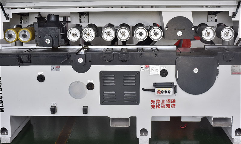 10、送料輪送料比履帶送料更經(jīng)濟(jì),更易于控制和維護(hù)。 壓料采用氣壓式,即使木材厚度變化較大,壓料壓力也是固定的,壓料厚度較寬,可達(dá)35mm。